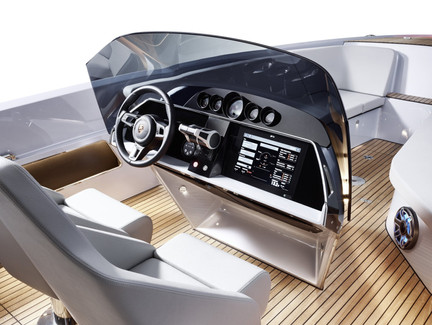But the electric yacht is not just powered by Porsche: Studio F. A. Porsche in Zell am See (Austria) was responsible for designing the helmstand. An original sports steering wheel from Porsche is on board. Five analogue gauges on the upper level of the instrument panel underline the Porsche look and provide an overview of the most important data. The two front seats have been redesigned by the team at Studio F. A. Porsche. In keeping with the high E-Performance, they offer plenty of lateral support. With raised backrests, integrated headrests and an embroidered crest, their look is inspired by the sports seats in Porsche sports cars.
