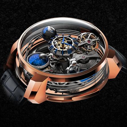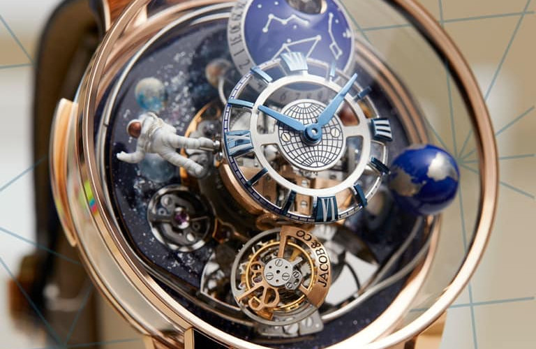 The 1-carat, 288-facet Jacob Cut® diamond, the magnesium-lacquered blue globe, the hand-painted astronaut rotate on themselves in 40 seconds, and the moon phase and date, including two half-sphere Jacob-cut diamonds (one carat total) travel with the tourbillon around the dial.