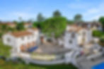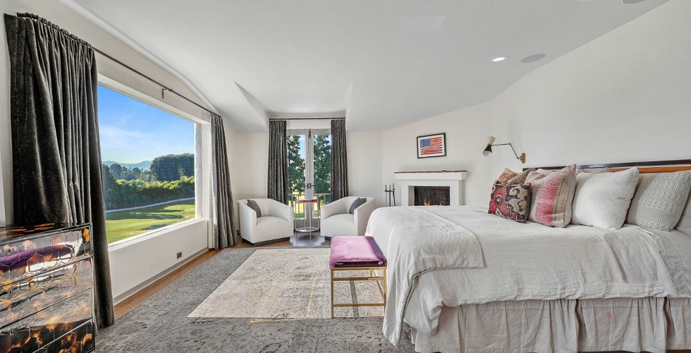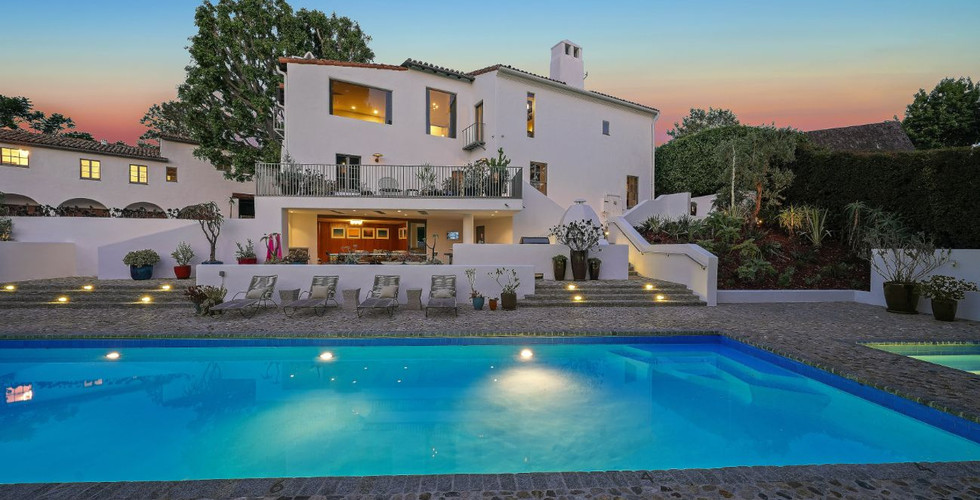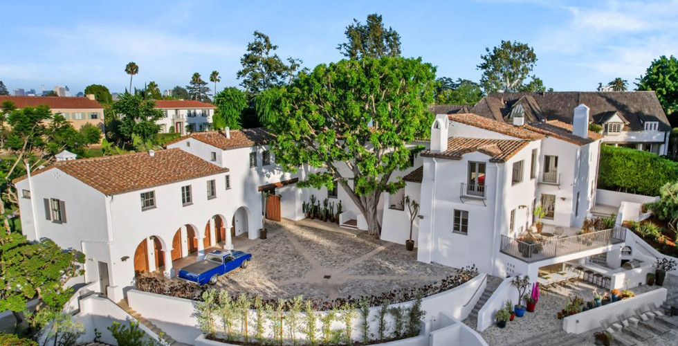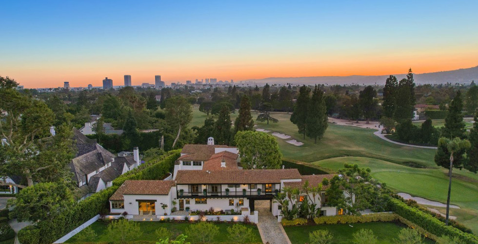 The half-ellipse-shaped mansion is gated and surrounds a striking cobblestone central courtyard with a fireplace. The chef's kitchen boasts polished brass countertops, gold-tiled splashbacks, and a 24-foot island. The voluminous family room sports floor-to-ceiling bookshelves. Big windows offer views of the golf course, the Hollywood Hills, and the iconic Hollywood Sign. Eight bedrooms are joined by a screening room, a 2,500-bottle, temperature-controlled wine vault, and an attached guest residence with a full kitchen and bath. The expansive backyard features lush greenery, many varieties of citrus trees, multiple lounge areas, a custom pizza oven, and a swimming pool. The home is listed on the National Register of Historic Places.