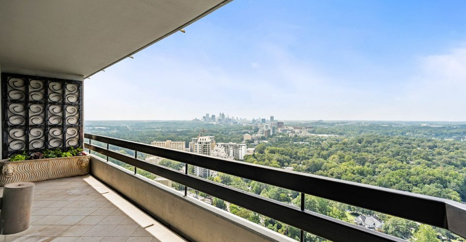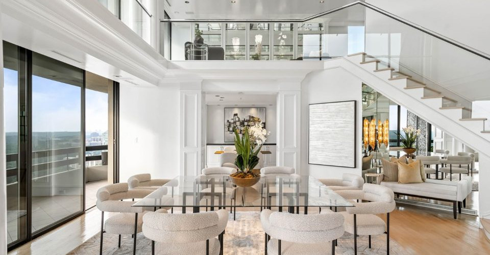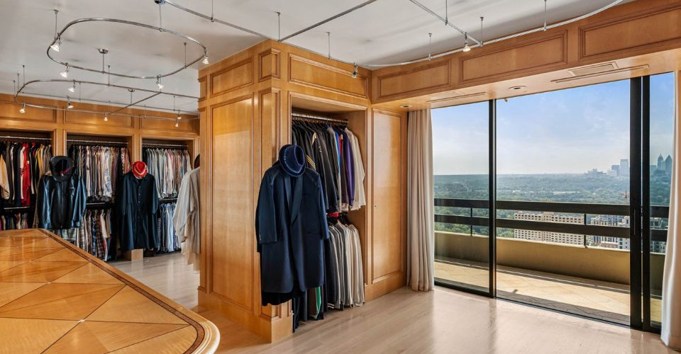 Elton, originally purchased a duplex on the 36th floor of the luxurious Park Place high-rise tower in Atlanta’s Buckhead neighborhood for $925,000, then added five neighboring units over the years to construct his 13,300-square-foot, four-bed, seven-bath residence spanning two floors. The meticulously designed estate features stunning wood walls, floor-to-ceiling windows, and 360 degrees of city skyline and western canopy views. Each room has been carefully appointed, with intricate moldings, Greek-style columns, glass-walled staircases, and unique chandeliers. Multiple balconies on all sides of the home offer gorgeous views from sunrise to sunset.