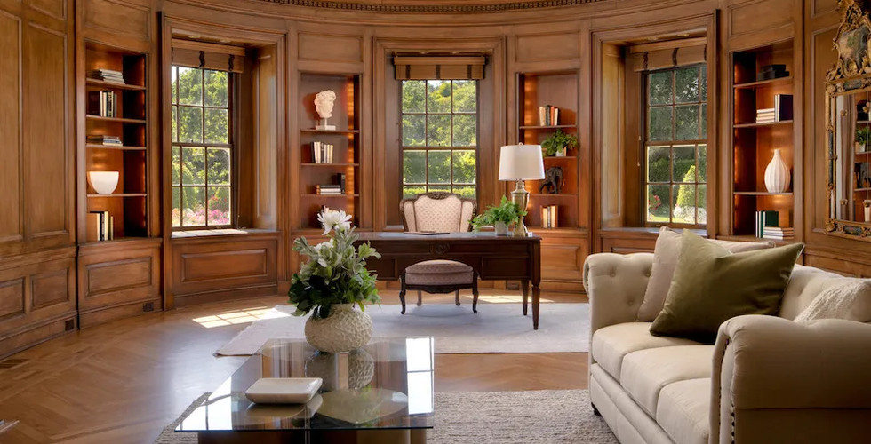 Inside, an abundance of windows and soaring ceilings invite the warmth of California's sun, bathing each room in natural light, highlighting the formal entry parlor and dining room, while the gourmet kitchen with a butler’s pantry is a chef’s dream. A spacious living room and a luxurious primary bedroom suite with two bathrooms and two dressing rooms offer unparalleled comfort. Fireplaces grace the living spaces and the primary bedroom, adding warmth and charm. The property features a stunning wood-paneled “Oval Office” and outside, the lush grounds feature a picturesque rose garden and mature trees, along with a gazebo/pavilion and a large swimming pool, creating an oasis of tranquility and elegance.